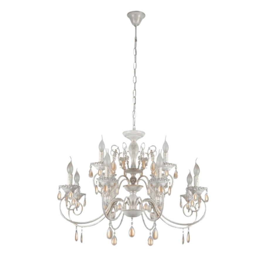 A Grand Statement of Luxury and Sophistication. Elevate your interior with the Amber Crystals Rice White & Gold Brushed Metal Chandelier—a stunning masterpiece designed to bring timeless elegance to your space. With 12 candle-style lights, rich amber crystals, and a refined gold brushed metal frame, this chandelier is perfect for grand living spaces, dining areas, and lavish entryways. Key Features: Amber Crystal Accents: Reflects warm, shimmering light for an opulent ambiance. Gold Brushed Metal Frame: A luxurious finish that enhances durability and elegance. Rice White Body: Offers a striking contrast, adding depth and sophistication. 12 Candle-Style Lights: Provides generous illumination, perfect for spacious interiors. E14 Bulb Compatibility: Supports multiple bulb options for adjustable brightness. Classic & Contemporary Design: Ideal for traditional, transitional, or modern interiors. Easy Ceiling Installation: Comes with mounting hardware for seamless setup. Technical Specifications: Number of Lights: 12 Candle-Style Crystal Type: Amber Frame Material: Gold Brushed Metal Finish: Rice White Bulb Type: E14 (Bulbs not included) Installation Type: Ceiling Mounted Dimensions: Suitable for large spaces Recommended Room Size: Large to Grand Spaces Illuminate your home with timeless grandeur—where elegance meets brilliance.