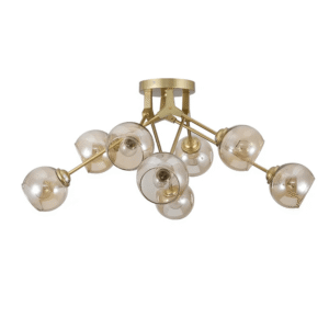 Make a bold statement with the Amber Glass Dome Gold Aluminium Bronze Wishbone Semi Flush Ceiling Light – 8 Lamps. Featuring eight gracefully arched arms, each holding a warm amber glass dome, this stunning fixture combines vintage allure with modern sophistication. Its semi-flush mount design is perfect for rooms with standard ceilings, creating a warm and inviting atmosphere. Ideal for living rooms, dining areas, bedrooms, or stylish commercial spaces, this eye-catching piece adds character and charm wherever it’s placed.