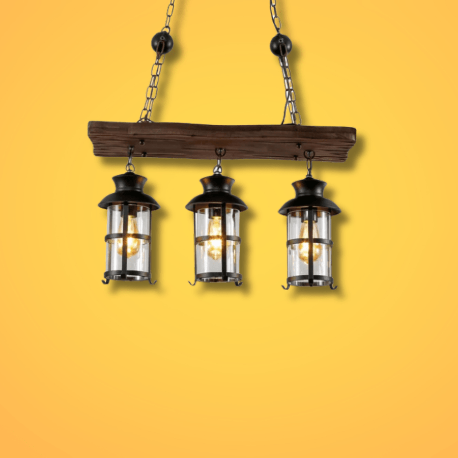 Farmhouse-Inspired Design: Combines a natural wood beam and glass cylinder shades for a warm, rustic feel.