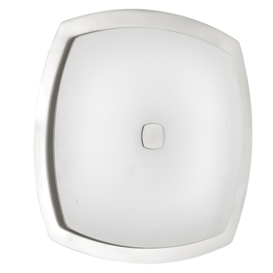 A modern square flush ceiling light featuring a sleek matt nickel metal frame with a single energy-saving 2GX13 socket. With a compact 65mm height and 335mm square design, it provides efficient, even illumination perfect for kitchens, bathrooms, and utility rooms. The integrated design supports a single 40W energy-saving bulb for cost-effective operation.
