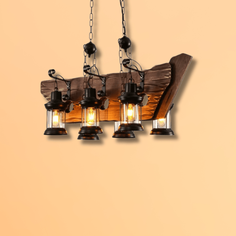 Create a bold statement in your space with the Farmhouse Wood Marine Galley Nautical Kitchen Island Chandelier Ceiling Light. Measuring 900x340x330mm, this chandelier perfectly balances rustic charm and nautical inspiration — evoking the rugged beauty of a ship’s galley with its solid wood frame, dark metal chains, and industrial accents.