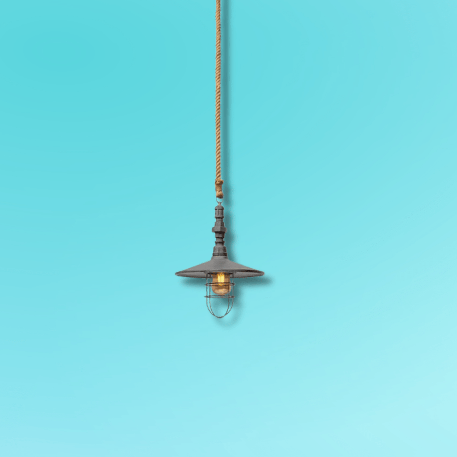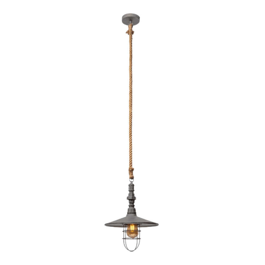 Industrial Vintage Design: A flat metal shade in silvery grey, paired with hemp rope suspension for a bold, rustic aesthetic.