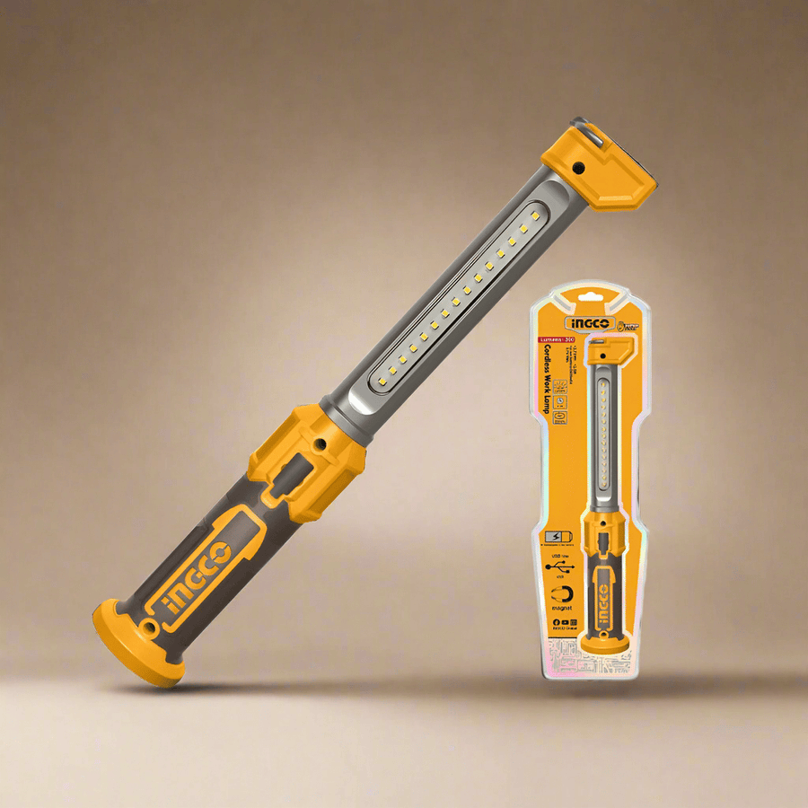 Brighten up your workspace with the Ingco Work Lamp – HWLI043006, designed for reliability, portability, and convenience. Featuring a powerful Li-polymer rechargeable battery, this compact lamp delivers up to 300 lumens of illumination, with both high and low settings to suit different environments. Built for professionals and DIY users, it comes with a hidden folding hook for hands-free hanging and a magnetic base that secures firmly to metal surfaces, giving you versatile lighting options wherever you need them. Lightweight at just 220g and USB rechargeable, this lamp is a must-have tool for workshops, garages, outdoor projects, and on-site jobs.