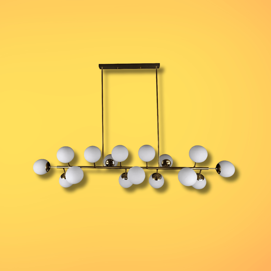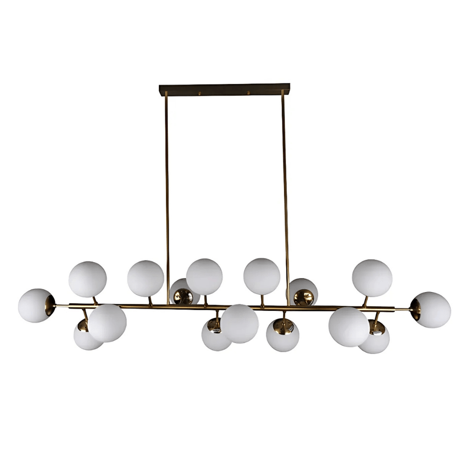 Make a bold statement with the Modern Molecule Style Opal Gold Metal Island Chandelier. Featuring sixteen opal glass globes gracefully perched on a sleek gold metal frame, this chandelier brings a touch of luxury and contemporary charm to any room. Its balanced design and soft, diffused light make it perfect for illuminating kitchen islands, dining areas, or grand living spaces.