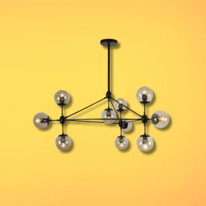 Elevate your interior with the Molecule Shape Black Rod Metal Amber Glass Globe Chandelier. Featuring ten beautifully crafted amber glass globes attached to sleek black metal rods, this statement piece brings warmth and sophistication to any space. Its bold molecular-inspired design adds a unique, artistic flair while delivering soft, ambient lighting — perfect for living rooms, dining areas, or large open spaces.