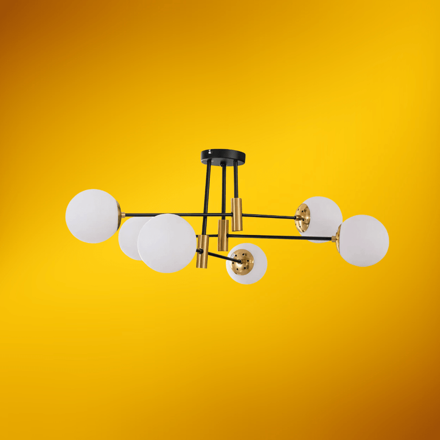 Add a touch of modern sophistication to your space with the Opal 6-Lamp Glass Globe Gold and Black Metal Semi-Flush Ceiling Light. Featuring six opal glass globes that emit a soft, diffused glow, this fixture is beautifully complemented by its gold and black metal frame. Its elegant design is perfect for contemporary, mid-century, or modern interiors.