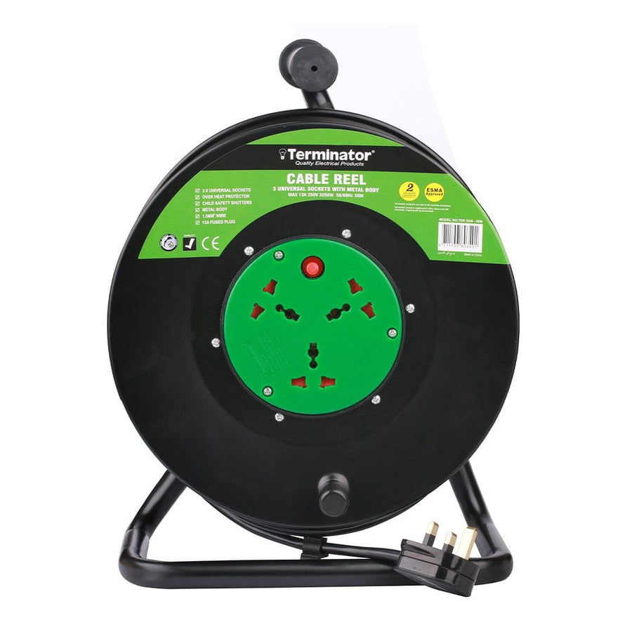 Manage extensive power needs with the Terminator 3-Way Universal Extension Reel Socket featuring a durable 50-meter cable and integrated heat protector. Designed for both indoor and outdoor use, this reel ensures reliable and safe power distribution.